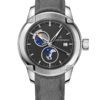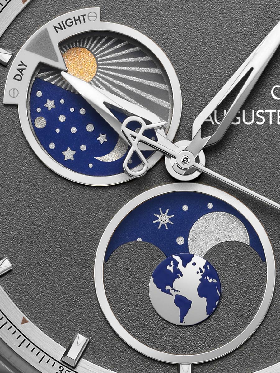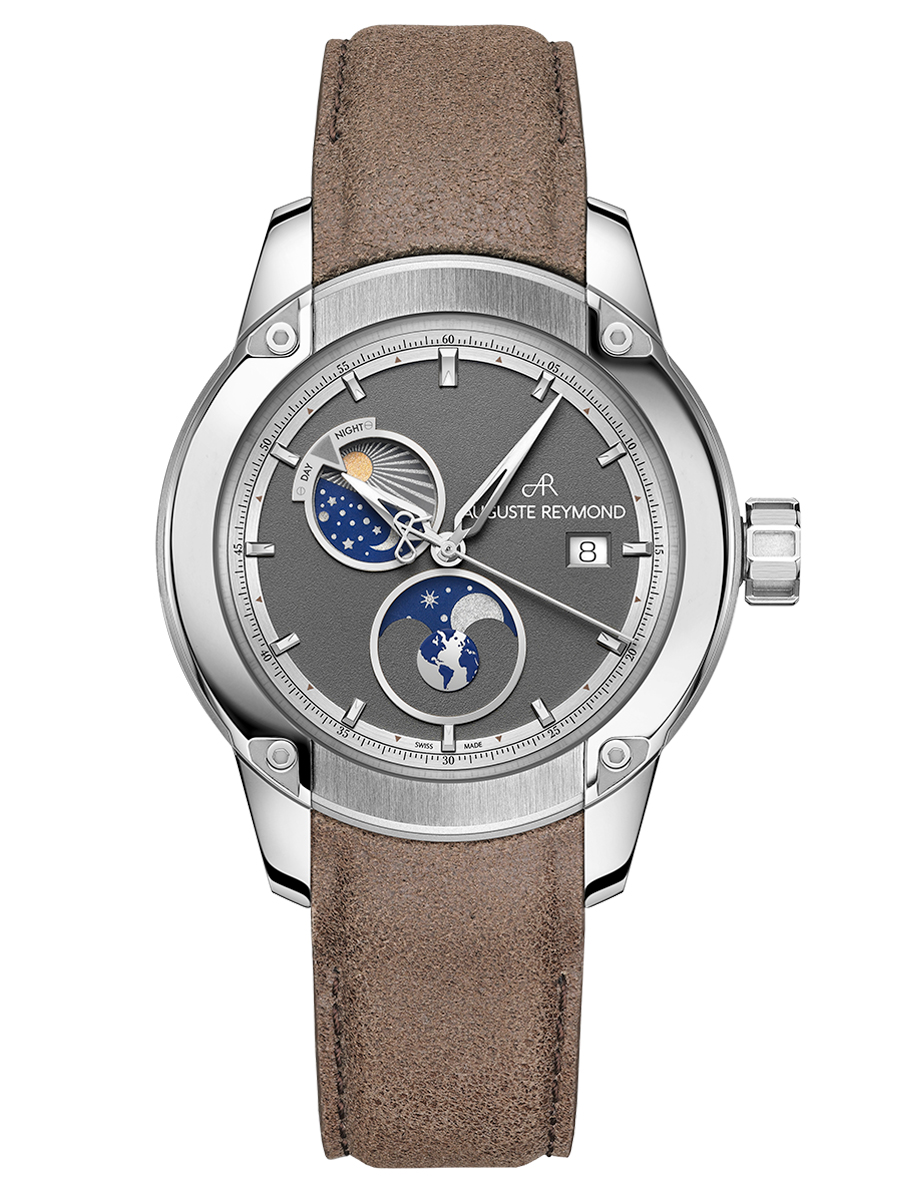 The sandblasted grey dial includes two fine metal rings encircling the day and night indicator and the moon phase and a date window at 3 o’clock. The Unity Day & Night watch is distinguished by its numerous details: the styling of the markers, the compass-inspired hands and the second hand adorned with the Auguste Reymond emblem.