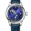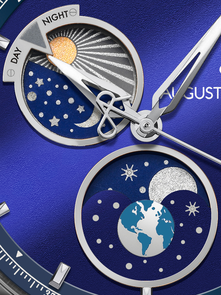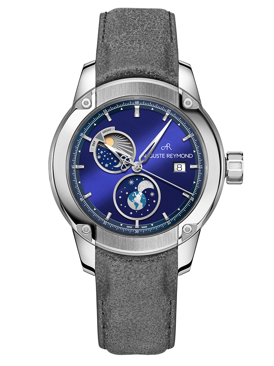 The sunbrushed blue dial includes two fine metal rings encircling the day and night indicator and the moon phase and a date window at 3 o’clock. The Unity Day & Night watch is distinguished by its numerous details: the styling of the markers, the compass-inspired hands, the integrated bracelet and the second hand adorned with the Auguste Reymond emblem.