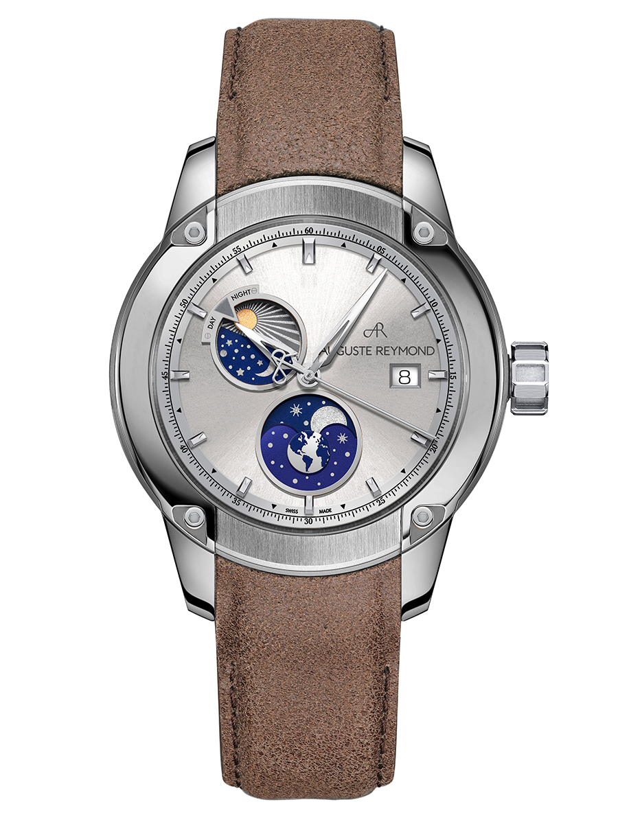 The sandblasted grey dial includes two fine metal rings encircling the day and night indicator and the moon phase and a date window at 3 o’clock. The Unity Day & Night watch is distinguished by its numerous details: the styling of the markers, the compass-inspired hands, the integrated bracelet and the second hand adorned with the Auguste Reymond emblem.