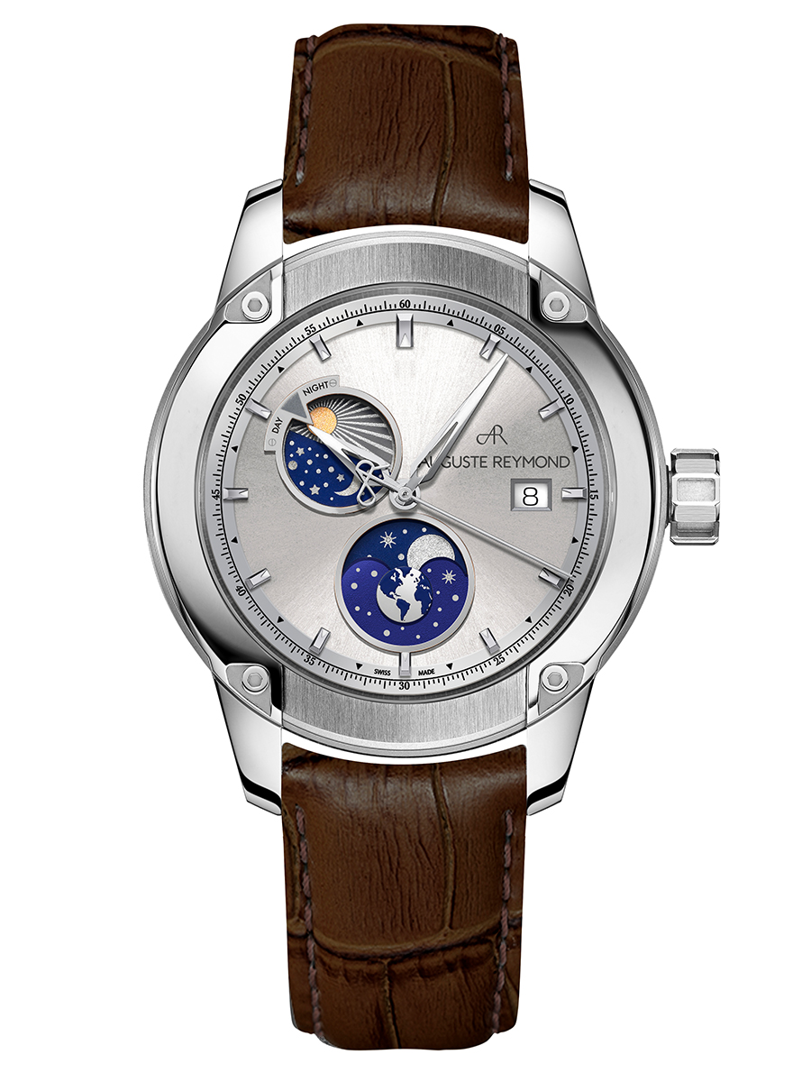 The sandblasted grey dial includes two fine metal rings encircling the day and night indicator and the moon phase and a date window at 3 o’clock. The Unity Day & Night watch is distinguished by its numerous details: the styling of the markers, the compass-inspired hands and the second hand adorned with the Auguste Reymond emblem.