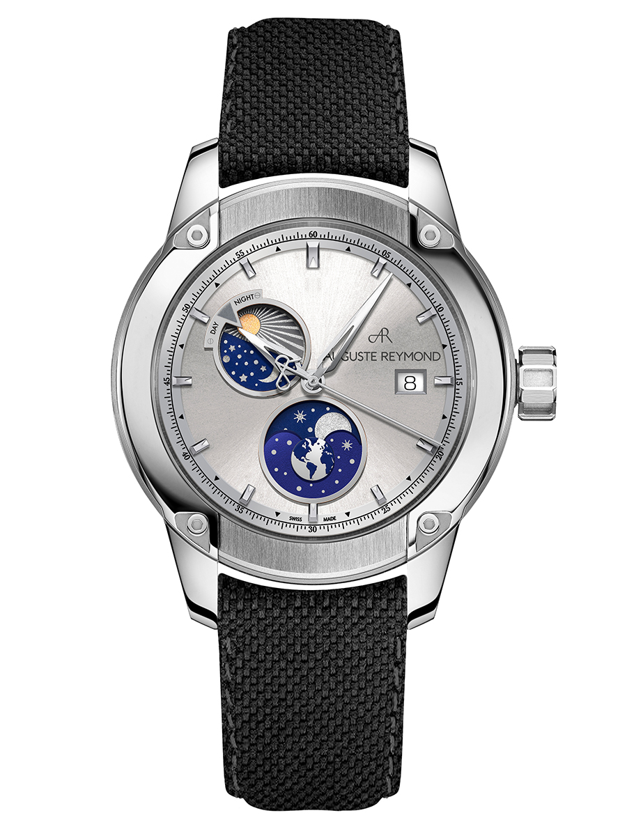 The sandblasted grey dial includes two fine metal rings encircling the day and night indicator and the moon phase and a date window at 3 o’clock. The Unity Day & Night watch is distinguished by its numerous details: the styling of the markers, the compass-inspired hands and the second hand adorned with the Auguste Reymond emblem.