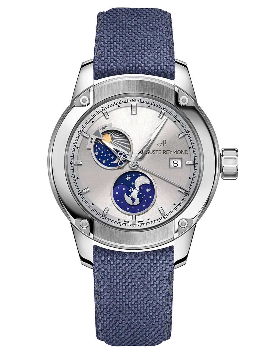 The sandblasted grey dial includes two fine metal rings encircling the day and night indicator and the moon phase and a date window at 3 o’clock. The Unity Day & Night watch is distinguished by its numerous details: the styling of the markers, the compass-inspired hands and the second hand adorned with the Auguste Reymond emblem.