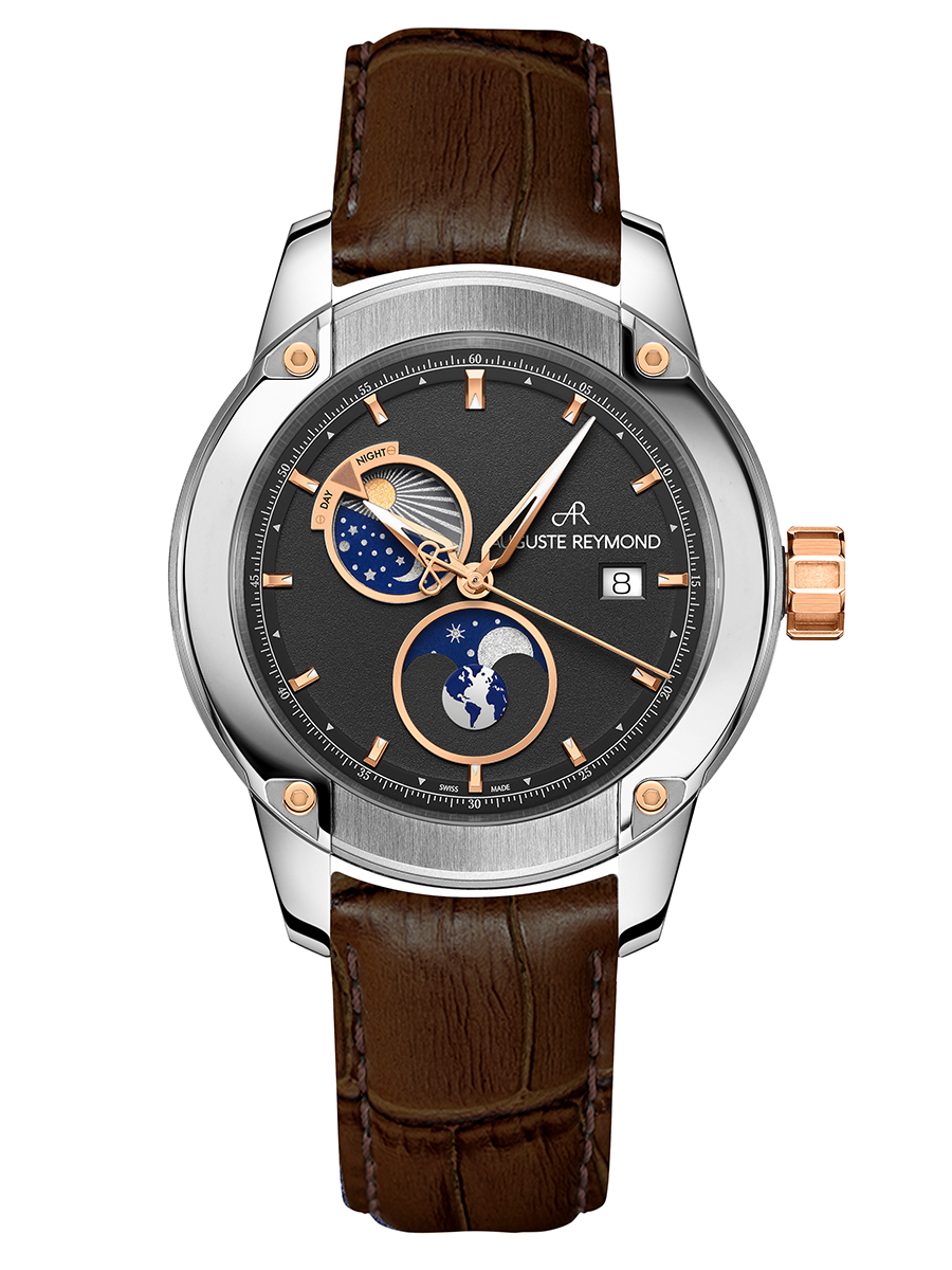 The sandblasted black dial includes two fine metal rings encircling the day and night indicator and the moon phase and a date window at 3 o’clock. The Unity Day & Night watch is distinguished by its numerous details: the styling of the markers, the compass-inspired hands and the second hand adorned with the Auguste Reymond emblem.