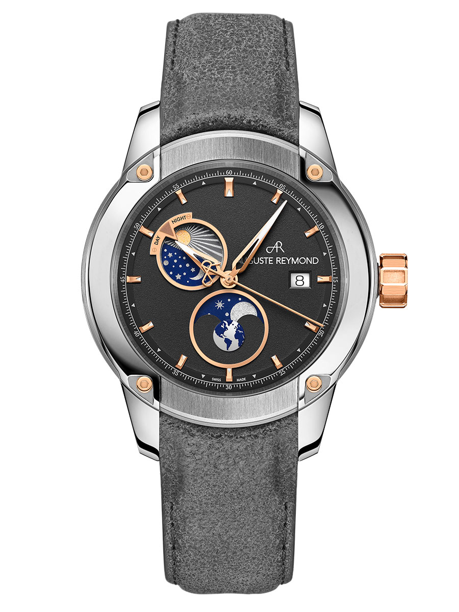 The sandblasted black dial includes two fine metal rings encircling the day and night indicator and the moon phase and a date window at 3 o’clock. The Unity Day & Night watch is distinguished by its numerous details: the styling of the markers, the compass-inspired hands and the second hand adorned with the Auguste Reymond emblem.