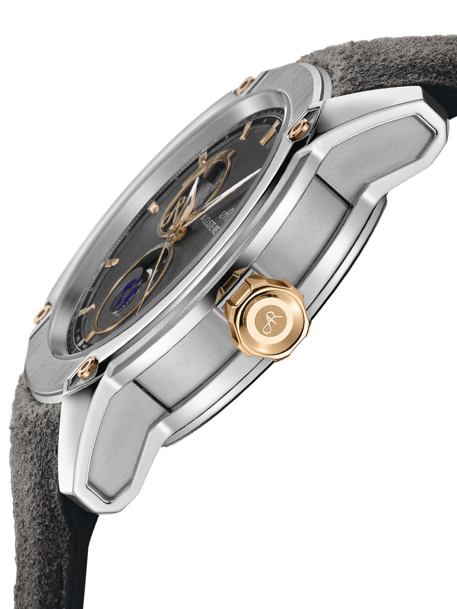 The 43 mm diameter steel case is harmoniously designed with alternating brushed and polished finishes. Its is composed of a middle part housing the movement and is accompanied by two screwed elements in the shape of a half-moon forming the horns, as well as a back with a sapphire glass.