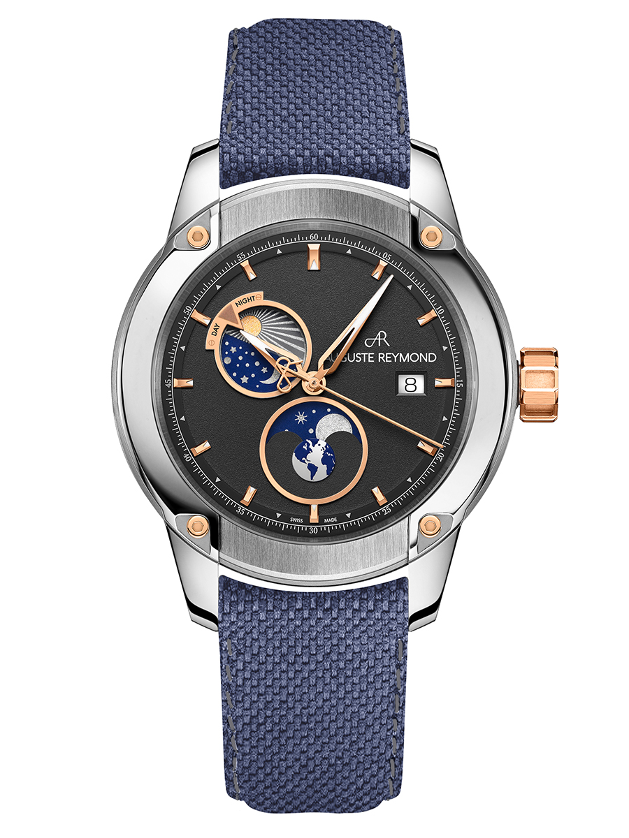 The sandblasted black dial includes two fine metal rings encircling the day and night indicator and the moon phase and a date window at 3 o’clock. The Unity Day & Night watch is distinguished by its numerous details: the styling of the markers, the compass-inspired hands and the second hand adorned with the Auguste Reymond emblem.