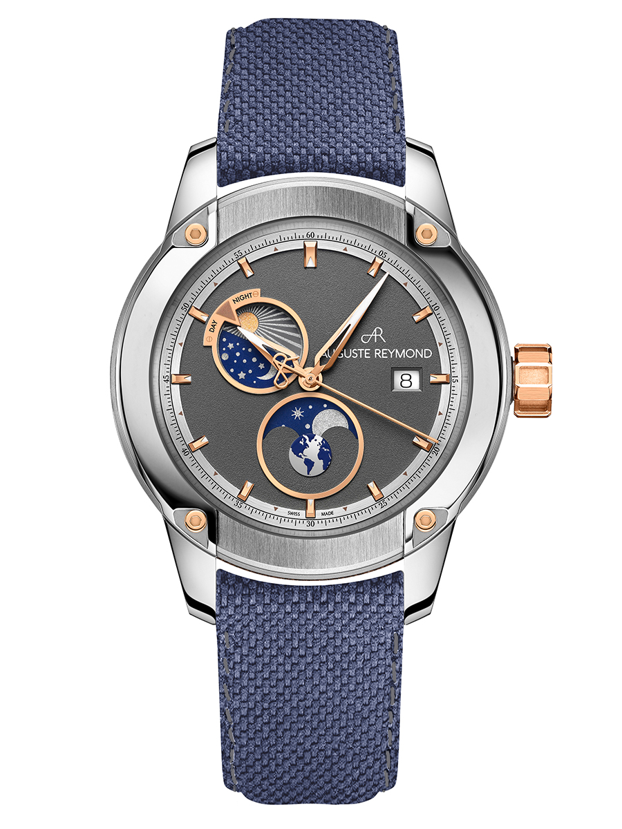 The sandblasted grey dial includes two fine metal rings encircling the day and night indicator and the moon phase and a date window at 3 o’clock. The Unity Day & Night watch is distinguished by its numerous details: the styling of the markers, the compass-inspired hands and the second hand adorned with the Auguste Reymond emblem.